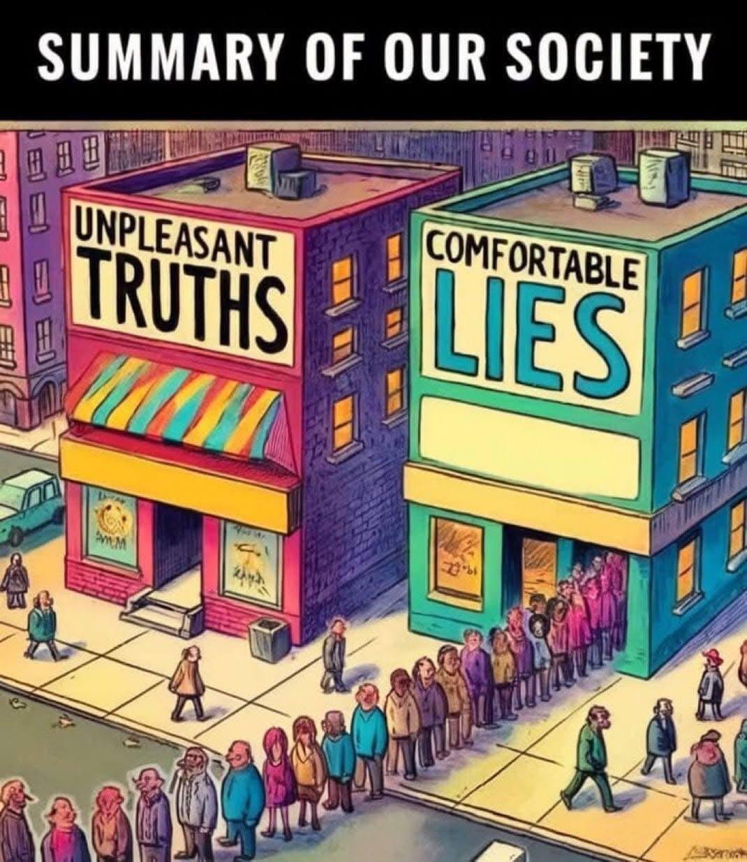 Traduction : Sommaire de notre société. Vérités déplaisantes. Mensonges confortables.