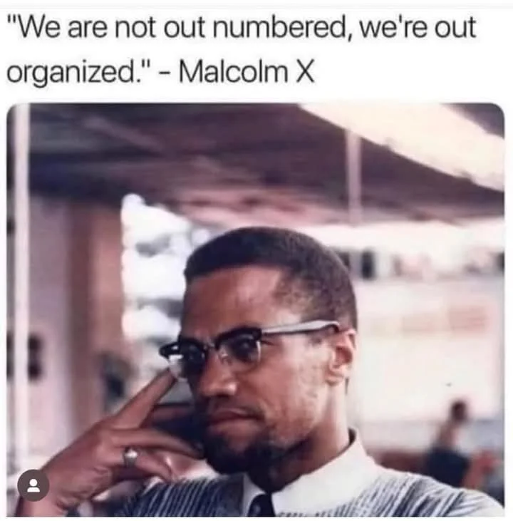 Traduction : “Nous ne sommes pas inférieurs en nombre, nous sommes inférieurs en organisation.” —Malcom X
